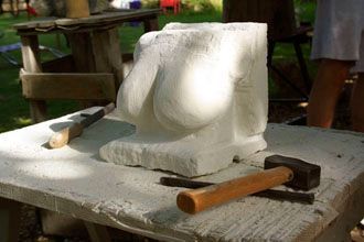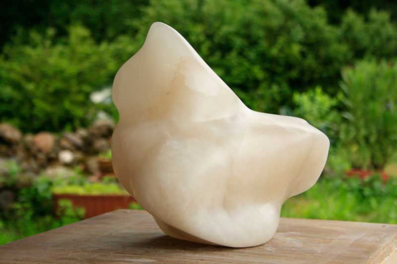 Deze steen wordt als blok geleverd en is iets harder dan albast, maar goed in te hakken. Belangrijk, er zijn geen breuklijnen in de steen. De ´huid' kan glad worden geschuurd, maar niet glanzend.